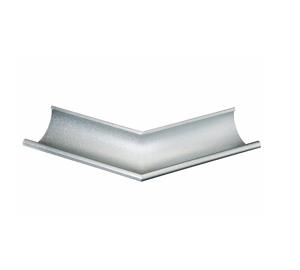 Udvendig 90°-hjørne geringen er udført i stål med Alu-Zink-belægning, af 55% aluminium og 45% zink overtrukket med en klar lak. Dette gør tagrenden ekstremt modstandsdygtig over for vind og vejr. Udvendig gering bruges til montering af tagrende om udvendigt 90°-hjørne.